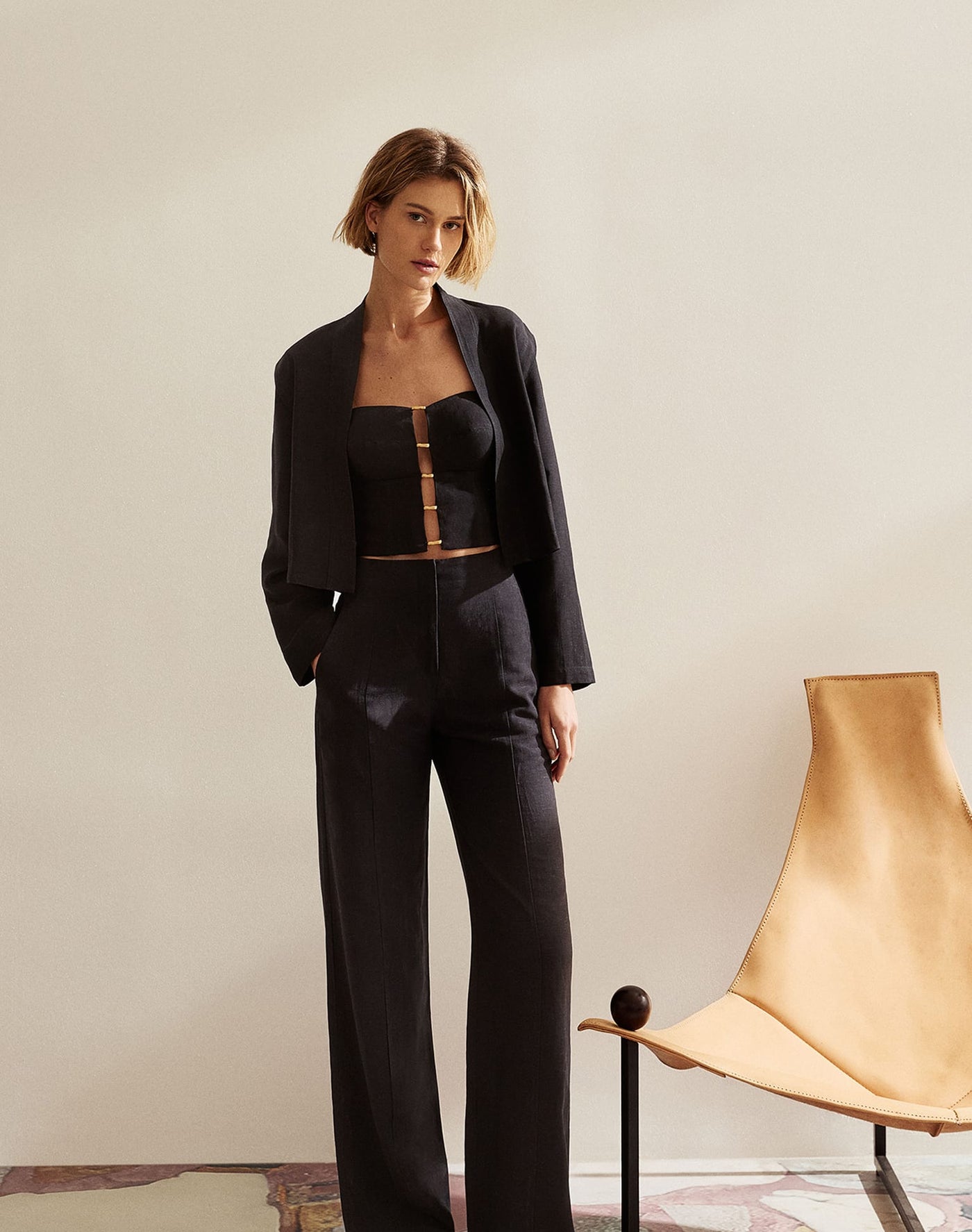 Pair the Emilia Strapless Top with coordinating shorts or tailored pants for a polished and cohesive outfit.